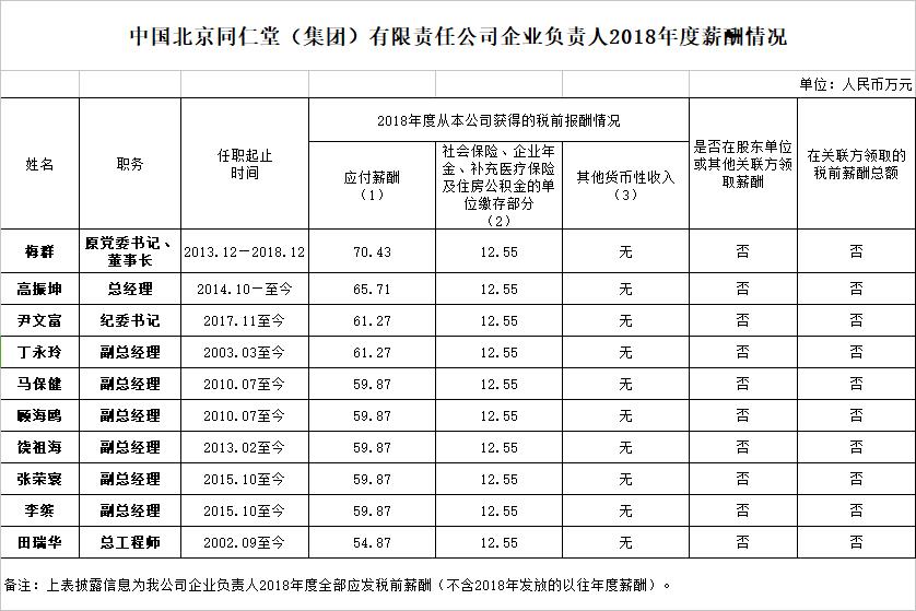 中國北京同仁堂(集團)有限責(zé)任公司企業(yè)負(fù)責(zé)人2018年度薪酬情況