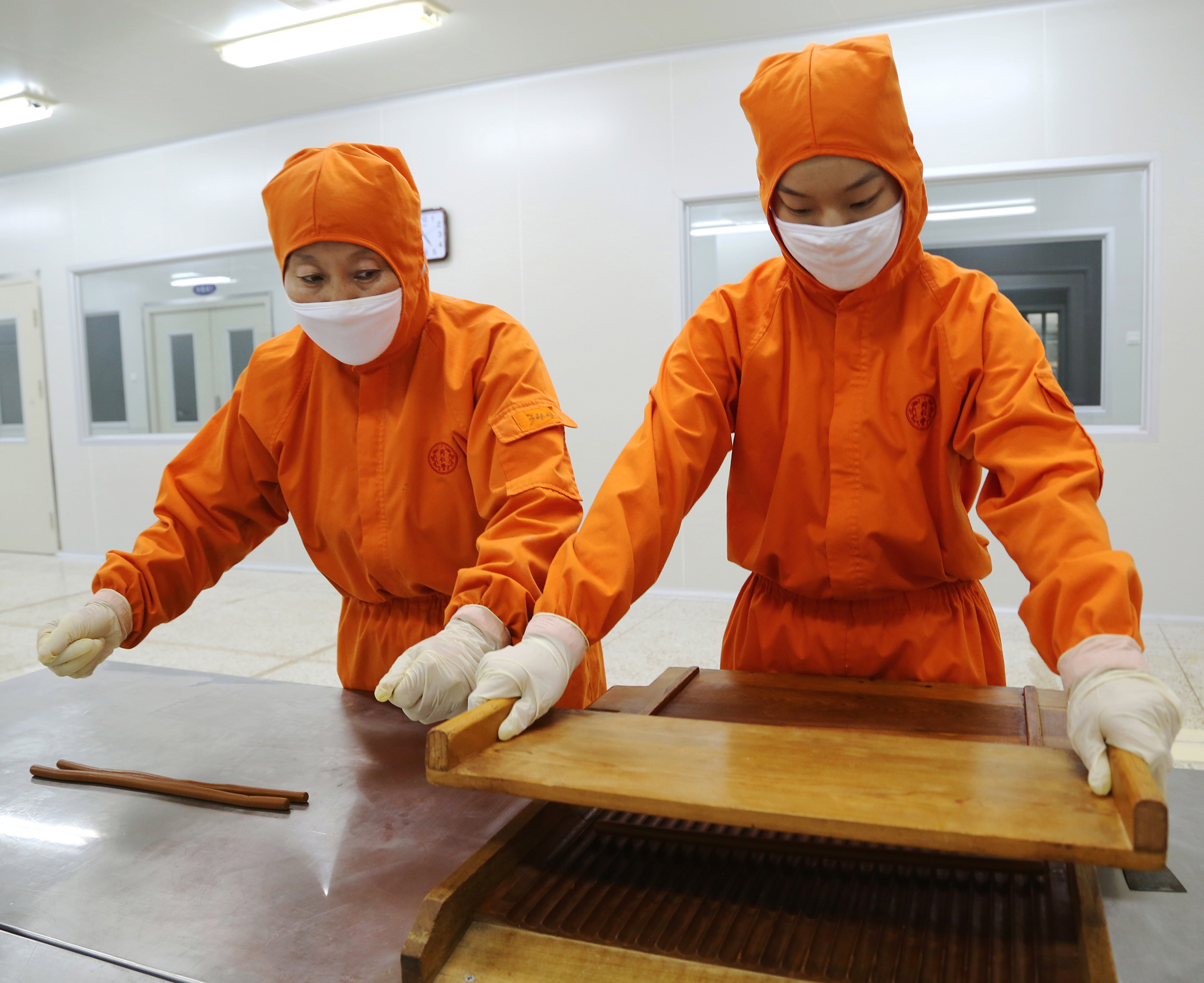 安宮牛黃丸是同仁堂十大王牌產(chǎn)品之一。“北京市郭鳳華安宮牛黃丸傳統(tǒng)制作技藝首席技師工作室”成立后,篩選9名優(yōu)秀職工成為郭鳳華的徒弟,制定3年教學(xué)計(jì)劃,囊括了職業(yè)道德、專業(yè)知識(shí)以及文化與技能傳承等內(nèi)容。成為郭鳳華的徒弟并不容易,不僅要有較好的專業(yè)基礎(chǔ),更要有一份長(zhǎng)期堅(jiān)持、為中醫(yī)藥奮斗終身的恒心。張菁被選中時(shí)非常開心,“很榮幸能夠成為郭師傅的徒弟,希望跟著郭師傅更加細(xì)致地學(xué)習(xí)安宮牛黃丸的專業(yè)知識(shí)和傳統(tǒng)手工技藝。希望自己能夠?yàn)榘矊m牛黃丸手工技藝的傳承貢獻(xiàn)力量。”