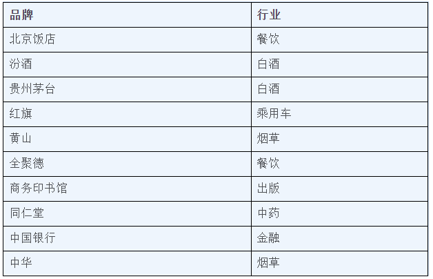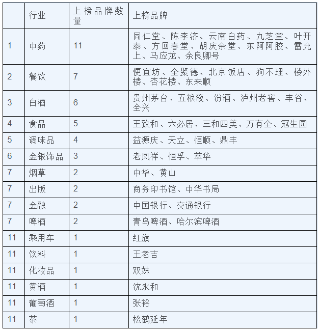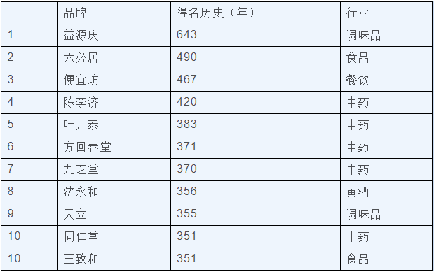 10個(gè)歷史最久的上榜品牌中,有4個(gè)中藥品牌,食品和調(diào)味品各2個(gè),餐飲和黃酒各1個(gè)。