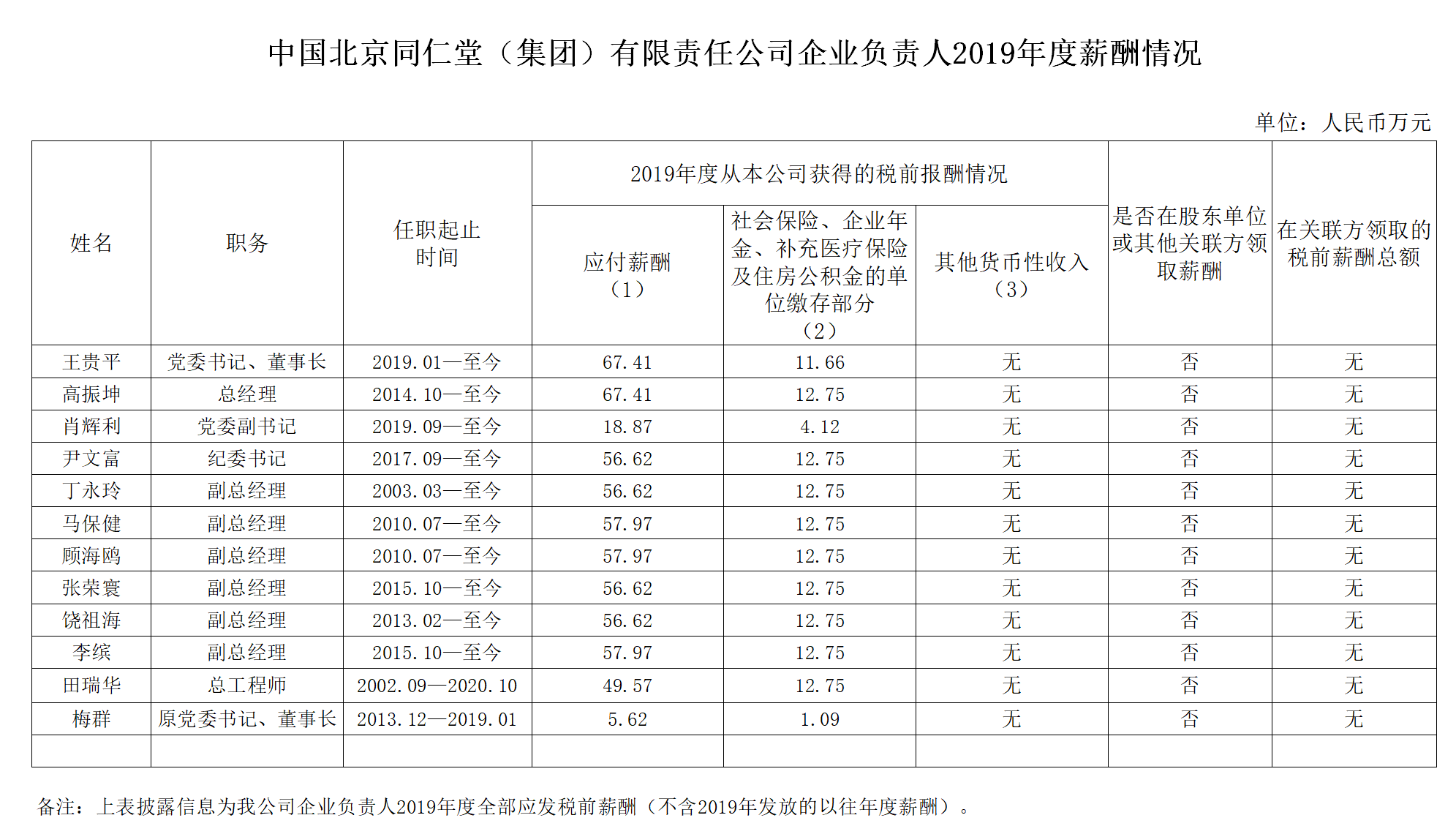 中國北京同仁堂(集團)有限責(zé)任公司企業(yè)負責(zé)人2019年度薪酬情況
