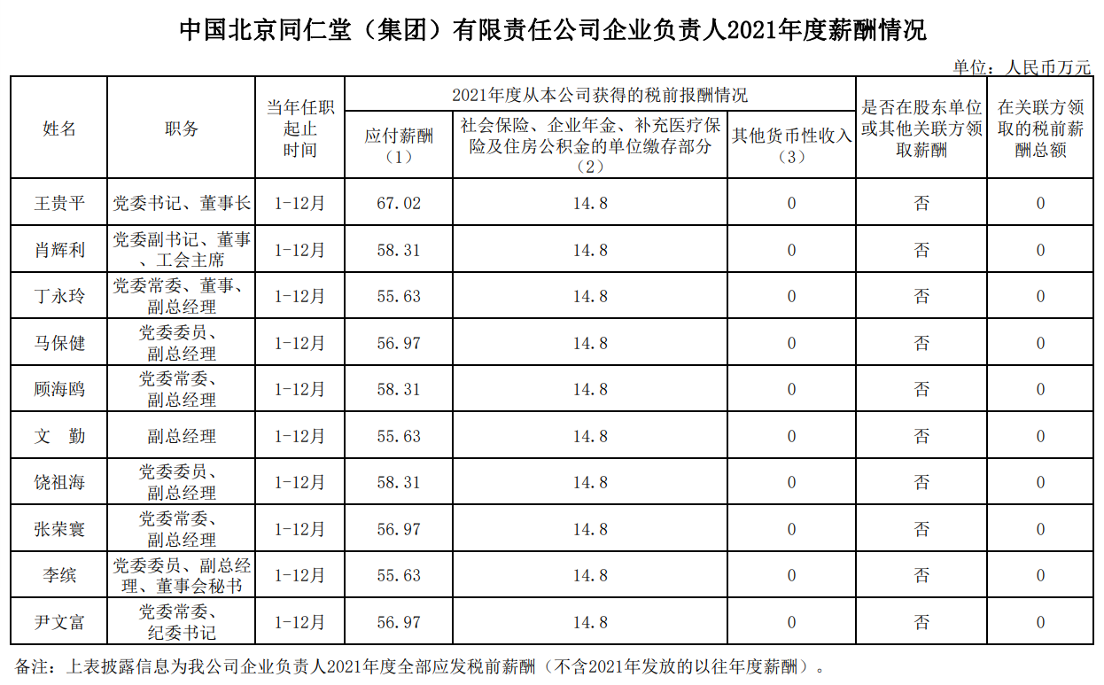 中國北京同仁堂(集團)有限責任公司企業(yè)負責人2021年度薪酬情況