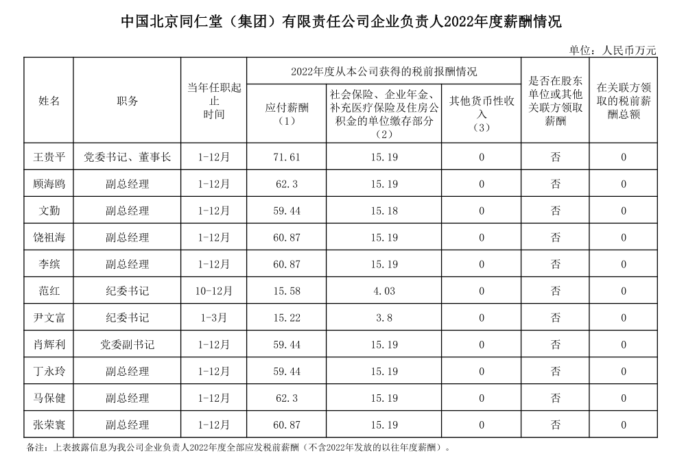 中國北京同仁堂 ( 集團(tuán) ) 有限責(zé)任公司企業(yè)負(fù)責(zé)人 2022 年度薪酬情況