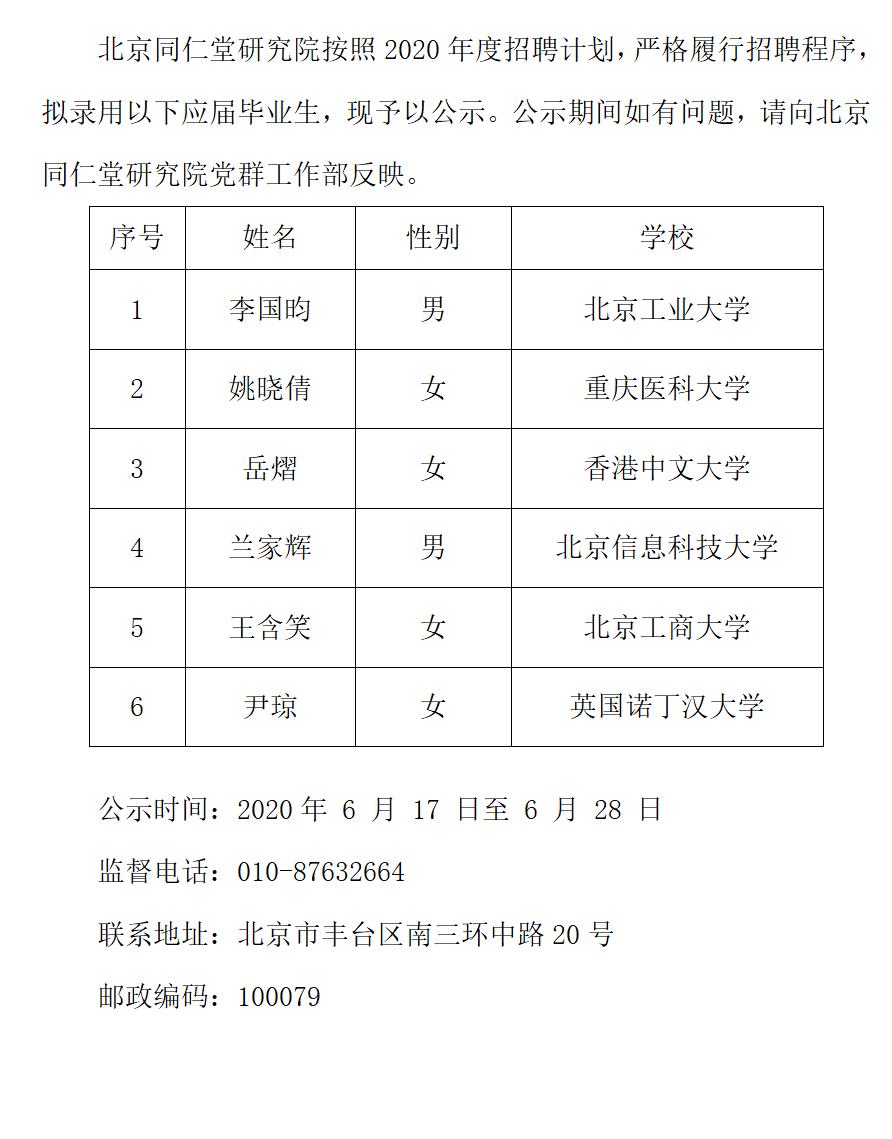 北京同仁堂研究院擬錄用應(yīng)屆畢業(yè)生公示信息