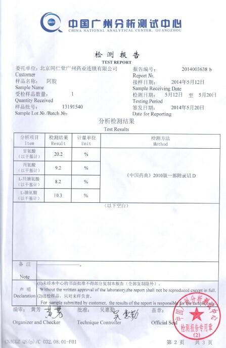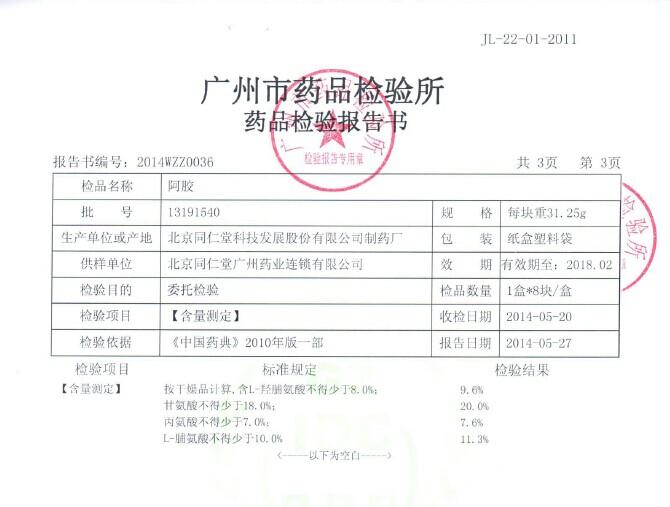 一、我公司將該批次產(chǎn)品分別送往廣州市藥品檢驗(yàn)所、中國(guó)廣州分析測(cè)試中心進(jìn)行甘氨酸、丙氨酸、L-羥脯氨酸、L-脯氨酸的含量復(fù)測(cè)。其中中國(guó)廣州分析測(cè)試中心為《消費(fèi)者報(bào)道》雜志發(fā)表《6品牌阿膠檢測(cè)比對(duì)報(bào)告一:北京同仁堂阿膠原料質(zhì)量較差》報(bào)道的檢測(cè)數(shù)據(jù)來(lái)源機(jī)構(gòu)。