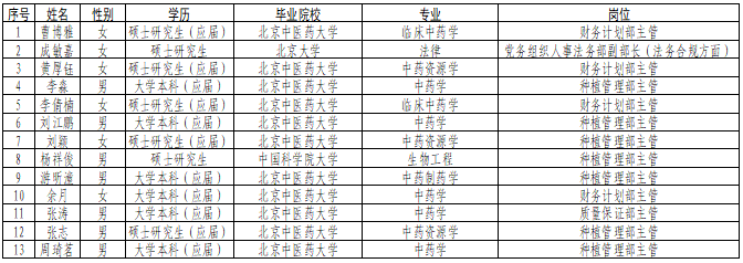 根據(jù)《北京同仁堂供應(yīng)鏈管理有限責(zé)任公司招聘工作方案》,通過網(wǎng)上發(fā)布公告、簡歷篩選、資格審查、面試、筆試、人事檔案核查等招聘環(huán)節(jié),經(jīng)供應(yīng)鏈公司黨支部會議審議通過,擬招聘以下人員,現(xiàn)公示如下: