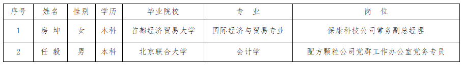 根據(jù)《北京同仁堂中藥配方顆粒投資有限公司招聘工作方案》,通過(guò)網(wǎng)上發(fā)布公告、簡(jiǎn)歷篩選、資格審查、面試、筆試、人事檔案核查等招聘環(huán)節(jié),經(jīng)配方顆粒公司黨支部會(huì)議審議通過(guò),擬招聘以下人員,現(xiàn)公示如下: