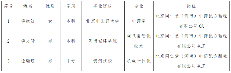 根據(jù)《北京同仁堂中藥配方顆粒投資有限公司招聘工作方案》,通過網(wǎng)上發(fā)布公告、簡歷篩選、資格審查、面試、筆試、人事檔案核查等招聘環(huán)節(jié),經(jīng)配方顆粒公司黨支部會議審議通過,擬招聘以下人員,現(xiàn)公示如下:
