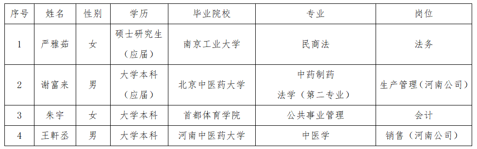 根據(jù)《北京同仁堂中藥配方顆粒投資有限公司招聘工作方案》,通過網(wǎng)上發(fā)布公告、簡歷篩選、資格審查、面試、筆試、人事檔案核查等招聘環(huán)節(jié),經(jīng)配方顆粒公司黨支部會議審議通過,擬招聘以下人員,現(xiàn)公示如下: